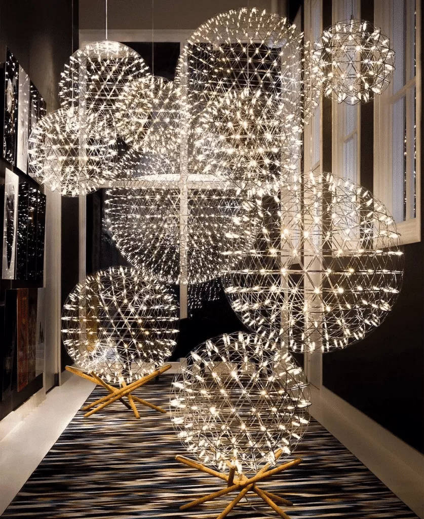 火花球吊灯的设计灵感来源于星空,灯珠的排列仿佛是烟花在夜空中绽放的瞬间。每一颗灯珠大小不一,散发出迷人的光效,形成了一种如梦似幻的氛围。当灯光点亮时,整个空间仿佛被星光包围,令人心驰神往。这种独特的设计不仅让人眼前一亮,更让人感受到设计师对美的追求与大胆的想象力。