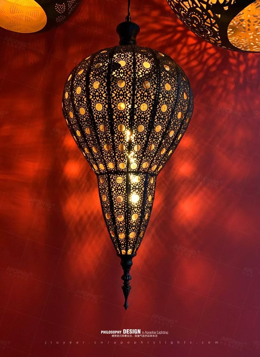 手工镂空的金属纹样如密语图腾,每一处凿刻都是匠人对北非美学的虔诚朝拜;暖光从圆孔与花纹中溢出,在墙面投射出梦幻的光斑,仿佛将撒哈拉沙漠的星河揉碎。